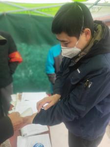 北刘各庄村防疫工作者在岗口对进出人员测体温,对进出人员登记