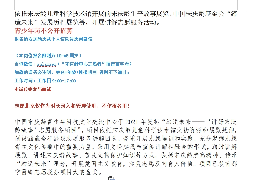 服务时间: | 讲解时间根据开馆和参观安排时间决定,值班时间为9:00-17:00 周二至周日,排班进行。 报名请发送简历或个人信息经历到微信 (本岗位报名限制为18-65周岁) 咨询微信:sqlzxzyz(“宋庆龄中心志愿者”拼音首字母) 加微信请务必注明:姓名+年龄+所报项目 否则不予通过。 工作时间:工作日9:00-17:00 本岗位需参与面试 |