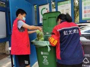 中青院社区报道团员垃圾分类桶前值守志愿服务。