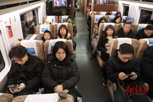 2月7日傍晚,魏含羽(前排左二)乘坐C2023次列车回天津武清途中。中青报·中青网记者 陈剑/摄