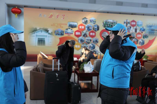 2月7日上午,北京朝阳站重点旅客服务区,魏含羽(右)和其他志愿者一起整理着装,准备上岗。中青报·中青网记者 陈剑/摄