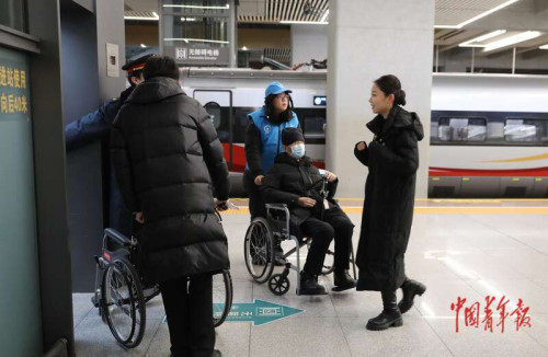 2月7日上午,北京朝阳站站台,魏含羽推着一位坐轮椅的老年旅客,走向其乘坐的高铁列车。中青报·中青网记者 陈剑/摄