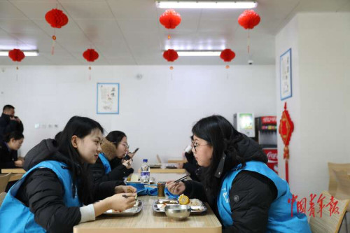 2月7日中午,北京朝阳站员工食堂,魏含羽(右)和石京媛(左)在吃午饭。在北京朝阳站重点旅客服务区,除了魏含羽,还有其他几名志愿者。来自北京城市学院的石京媛就是其中一位,她出生于2005年,目前在中药学专业读大三,今年是她在北京朝阳站进行志愿服务的第二年。中青报·中青网记者 陈剑/摄